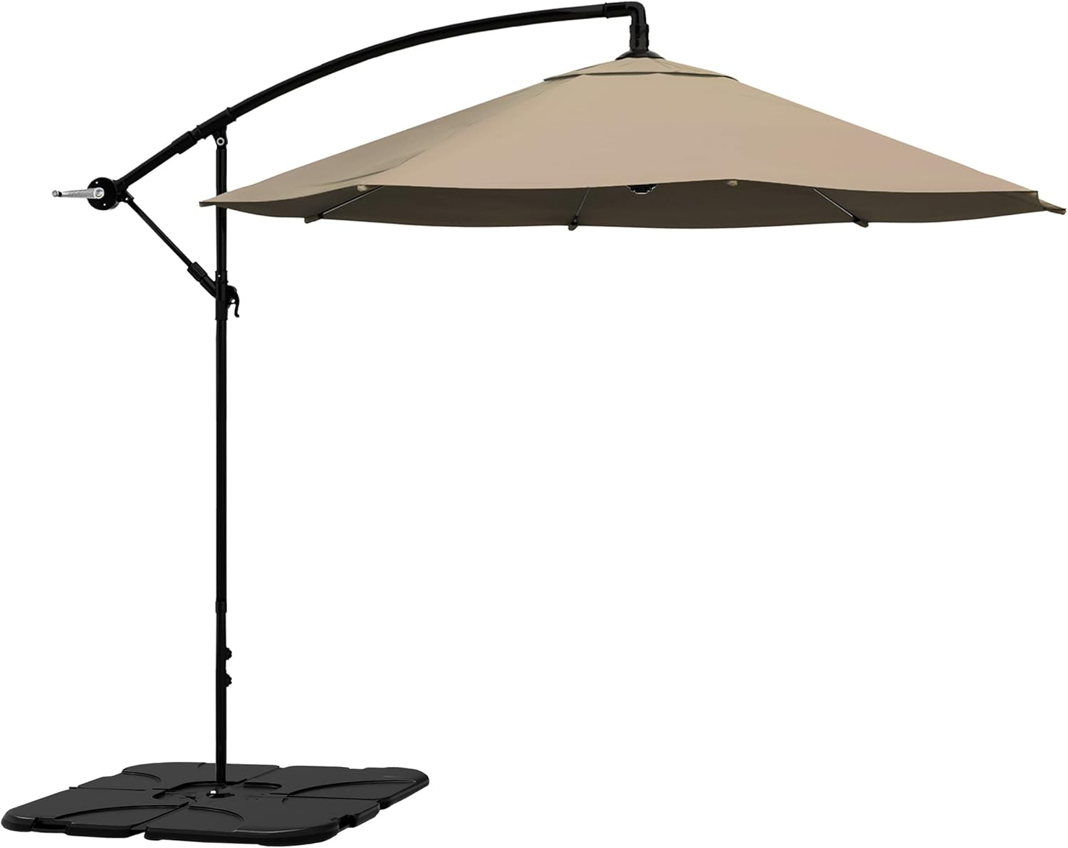 Create a cool and comfortable spot to entertain guests under an attractive piece of outdoor décor that provides quality sun protection with this 10-Foot Offset Patio Umbrella with Base Included by Villacera. The easy-to-use hand-crank opens and closes the sun umbrella in seconds to block sunlight so you can relax in the shade during hot summer days. Use the convenient handle of this shade canopy to adjust the vertical tilt in 5 positions, providing UV protection wherever the sun is shining. In addition, this sun shade includes a stable powder-coated aluminum cross base and has steel ribs for superior durability in the heat, wind, and rain. Simply crank the pool umbrella closed when not in use and secure it to the pole with the built-in strap.
