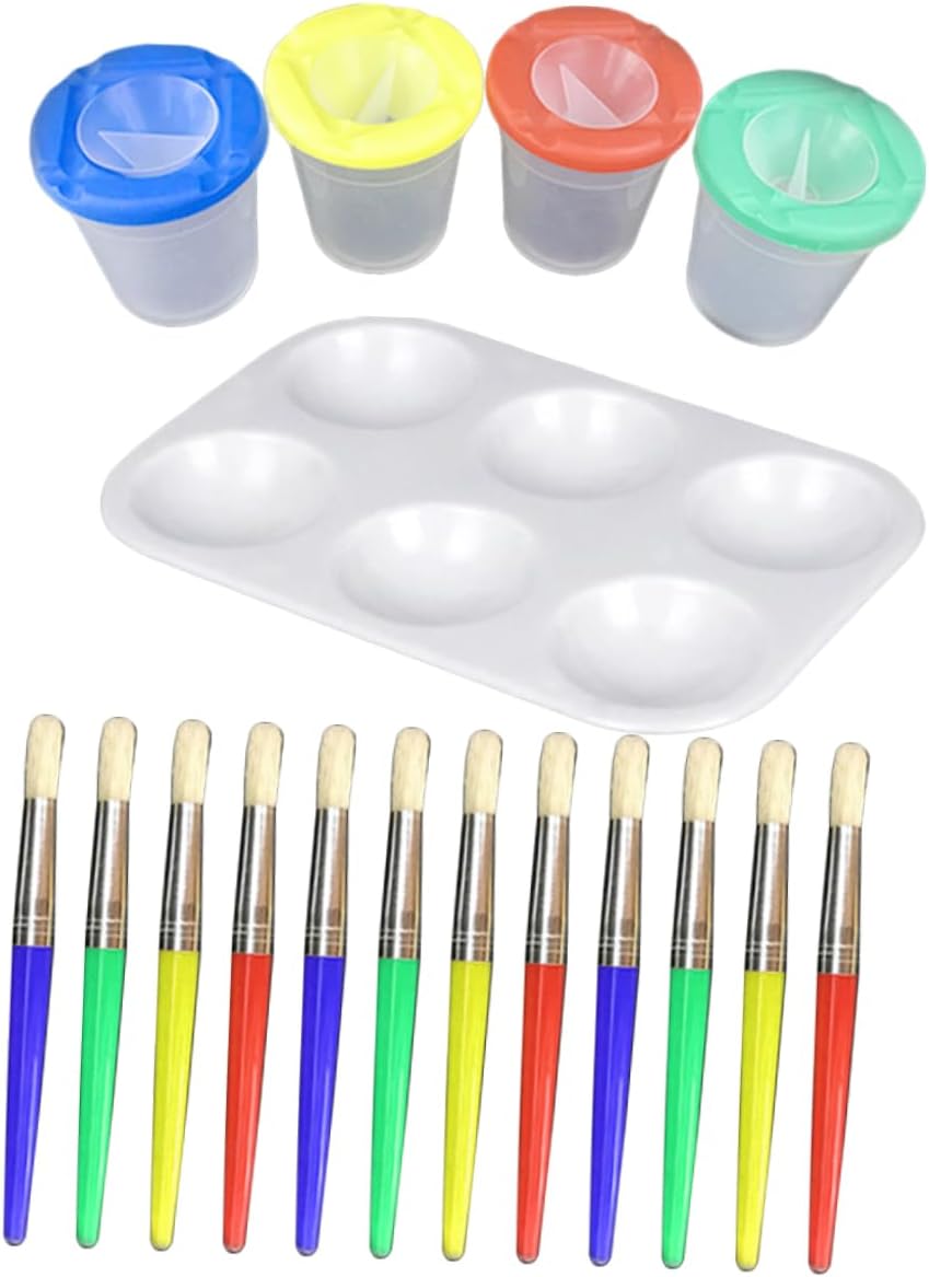 Package Include 51 x painting tool 18 x painting brushGoods DescriptionPaint Tool 5.Art Brush - ColorAssorted Color- Material: and nylon and wood.Bristles Paint Color- coded lid makes it easier to identify the color of the brush dipped.Watercolor Package Including 17 x painting tool 6 x painting brush. Features - Packing size: About 20 x 18 x 8. The cups are spill proof designed do need to worried about the leakage when the cup falls off. Perfect for artist to avoid spill messes. Clear cups make your the color directly and can also serve as brush rest or brush storage