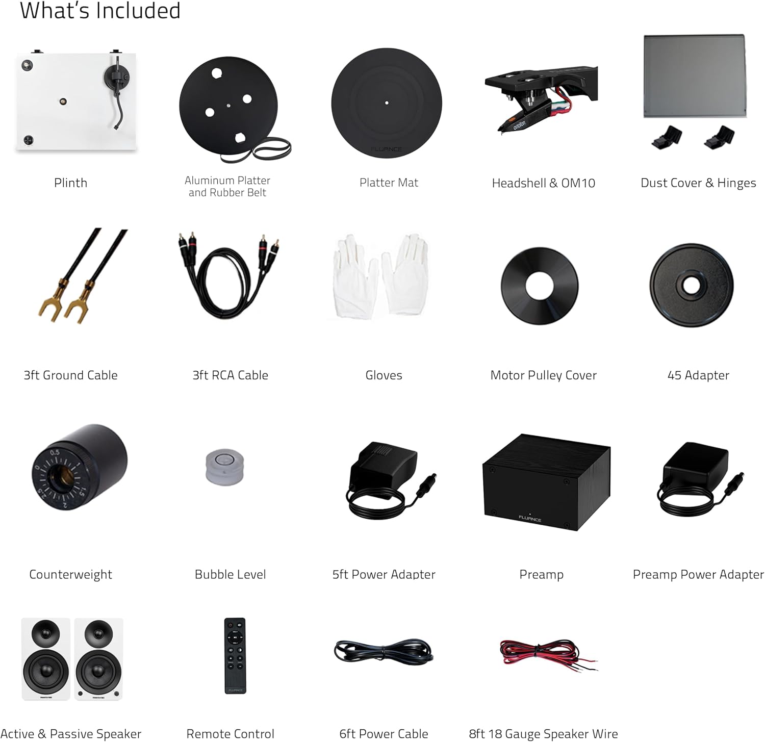 | Additional Features | RT82 Turntable, Dust Cover + Hinges, Bubble Level, Headshell with Ortofon OM 10 Cartridge, Counterweight, Metal Platter with Belt, Rubber Platter Mat, 5ft 100-240V (50/60Hz) AC Power Adapter, 2x 3ft 90pF RCA Cable, 3ft Ground Wire, 45 Adaptor, Motor Pulley Cap, User Manual, PA10 Unit, Power Adapter, Ai41 Powered Bookshelf Speakers (pair), Remote Control, 2x AAA Batteries, 6ft Power Cable, 8ft 18 Gauge Speaker Wire, Quick Start Guide, Lifetime Customer Support, 2 Year Manufacturer's Warranty |