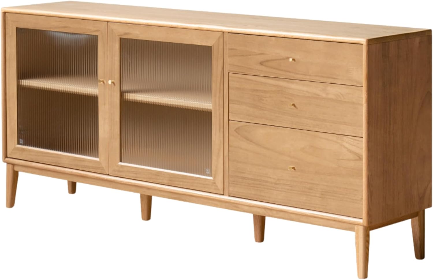 A practical and beautiful sideboard Three Drawers + Two Doors Large Capacity Reasonable partition, storage capacity MAX! Made of North American FAS grade oak, durable and full of texture The integration of Changhong glass Add hazy beauty to storage without clutter Dining room/living room, easy to use anywhere Take you to experience different storage aesthetics.1. The “100% solid wood” mentioned on the page refers to the wood parts excluding hardware and accessories (non-wooden parts such as metal and glass), and does not contain artificial boards or veneers.2. Main material is imported North American FAS grade oak, with beautiful grain, few knots.Paulownia wood is used as an auxiliary material for drawer inner panels and back panels. It is corrosion-resistant, wear-resistant, high-temperature resistant, does not deform. It has been the material for bellows handles since ancient times and is also a famous wood for making musical instruments in ancient China.3. Main material is Thai rubberwood, and it uses a finger-jointing process, which facilitates even stress release and reduces the likelihood of deformation, expansion, contraction, and cracking.New Zealand pine wood (top and bottom horizontal panels at the back of the cabinet); Paulownia wood wood (back panel and drawer boxes).4. The slab has a water-cloud-like texture and a fine matte finish.It uses odorless paint and an open-pore spraying process. After four coats and natural drying, t