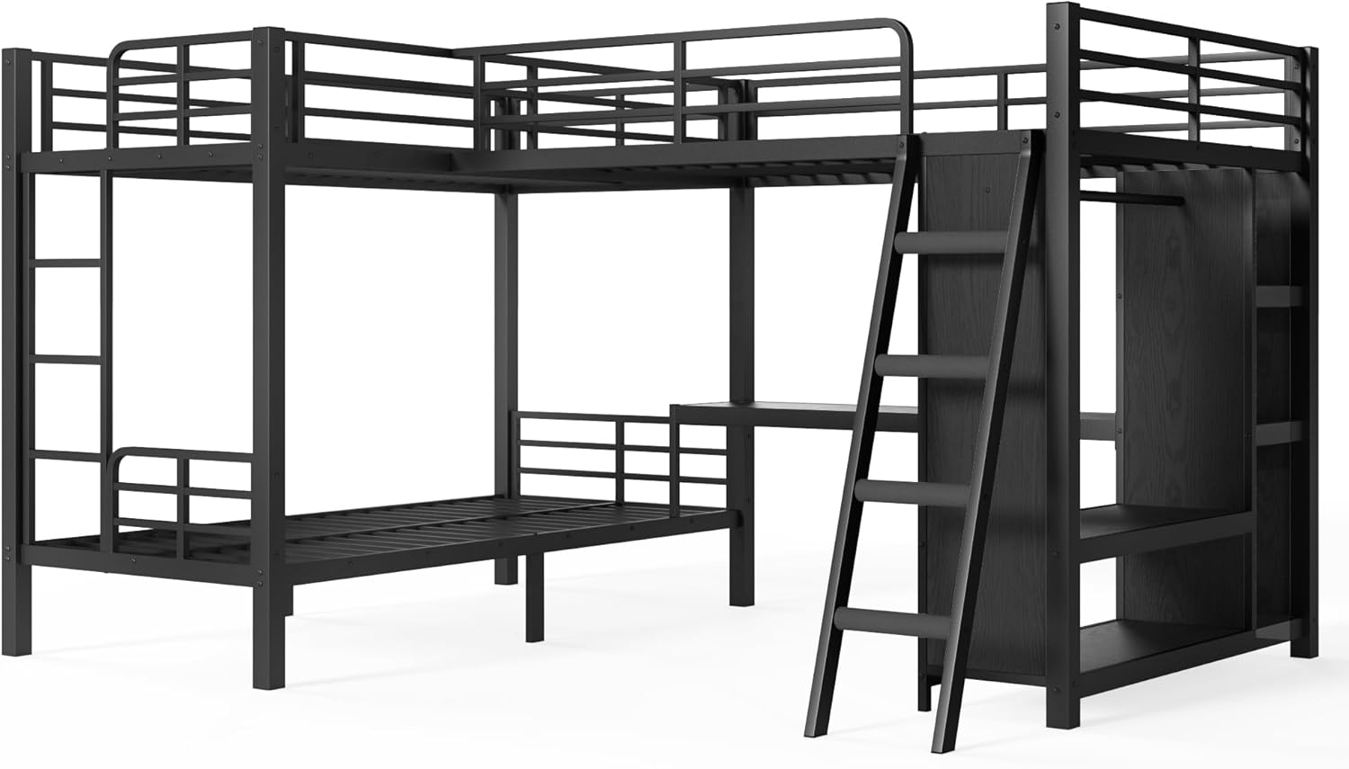 Upgrade your bedroom with the ultimate space-saving solution: our L-Shaped Triple Bunk Bed with Full Loft Bed, Desk, and Wardrobe. Designed to maximize every inch of your space while delivering comfort, safety, and style, this multi-functional bunk bed is the perfect choice for large families, kids’ rooms, dorms, guest rooms, or any space where optimizing floor space is a priority. Product Type: Metal Triple Bed Color: Black Size: Twin XL/Twin XL+Full Loft Material: Metal+MDF Overall Product Dimension: 118.11''L*82.68''W*64.29''H Overall Product Weight: 200.84LBS Weight Capacity: 350LBS Number of Each Bed Slats: 19pcs for Full; 20 pcs for Twin XL Recommend Mattress Thickness: 6'' for Upper Bed; 6'' -8''for Bottom Bed Number of Package: 3 Package Dimension & Weight: Please refer to the Specification Level of Assembly: Full Assembly Needed Eligible for Hardware Packs: Yes Note: All the pictures are taken by actual samples, slight chromatic aberration may occur due to lighting or display.