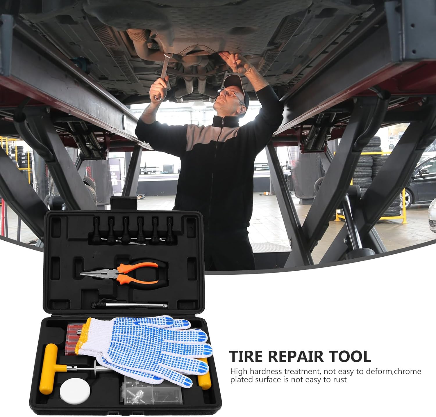 Package List 6 x extended covers 6 x copper nuts 6 x plastic nuts 6 x spools 4 x valves 1 x small box 1 x four-in-one tool 1 x 1 x cutter 2 x 2.5 internal hexagons 1 ruler 1 x pliers 1 x large box 1 x threaded needle 1 x thread needle tire rubber strips 2 x spare needles 1 x mail order box 1 pair x gloves Features -Product Info:Tire repair tool set -Material: Steel, rubber, aluminum alloy, plastic. -Size: About 14.50X9.50X3.00cm/5.70X3.73X1.18in. -Color: Assorted. - More application: car, motorcycles, ATVs, tractors, lawn mowers, RV, dirt bikes, trailers, trucks and spare tire repair kit Bike Tire Repair Tools. - with strong strength and maximum endurance Auto Tire Repair Kit. - Our tire plug kits have everything you need to make repair easily Tire Repair Tools. - Portable and easy to use and store. Suitable for different car, motorcycles and electric vehicles Vehicle Tire Repair Kit. - This kit with needle, can pierce into easily no matter what tires you repair Car Tire Repair Kit.Goods DescriptionVehicle Tire Repair Kit Our product is made of that is strong and durable enough to be used when repairing motorcycle.Tire Repair Kit It is also light and compact and can be stored in a backpack every time you ride.Bike Tire Repair Tools The tire repair box is essential, because it is an indispensable tool for every rider