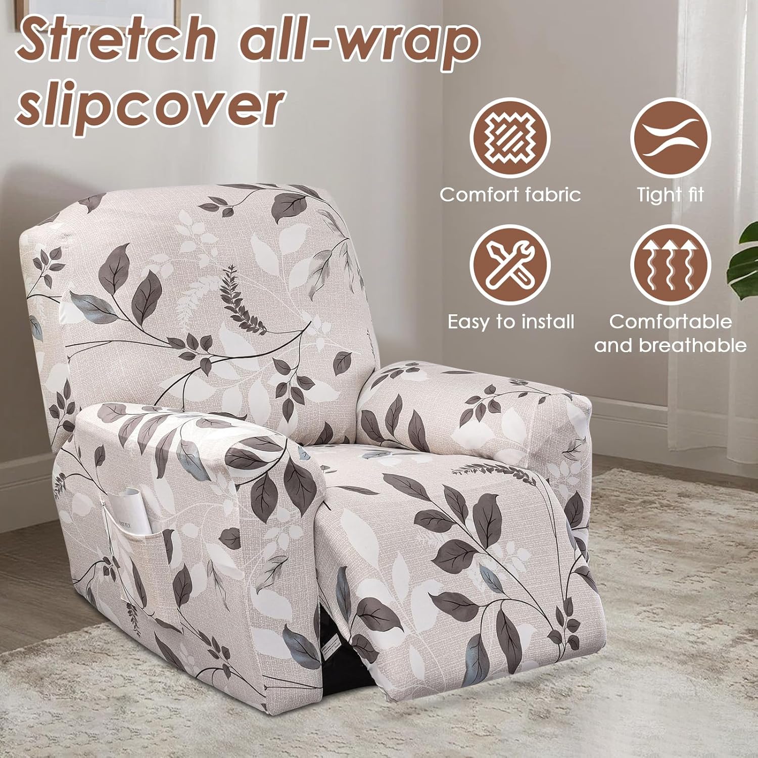 Parts List:One Set of 4-Piece Recliner Chair Covers (With Pockets On One Side Only)Product Specification:Description:Our 4-piece recliner slipcovers are made of 92% polyester + 8% spandex, soft; breathable and highly elastic to ensure a snug and comfortable fit, designed for 1-seater recliners for protection and comfortKey Feature:Comprehensive Protection: Elasticized back corners enhance anti-slip, full coverage design resists stains, abrasion and pet damage, suitable for families with children and petsEasy to Install: 4-piece design simplifies installation, elastic bottom and ring design is stable and won't shift, and the right arm has a side pocket for easy storage of small itemsSpecification:Product Name: Recliner Chair CoversMaterial: PolyesterSize: Rear for Width: 70-101cm/27.6-39.8inchFront Part Applies: 58-86cm/22.8-33.9inchThe left and right part is suitable for 66-91cm/26-35.8inchSuitable for Sofa Height: 76-102cm/29.9-40.2inchStyle: Style 1, Style 2, Style 3Note:1. There may be slight differences between the picture and the actual color of the commodity. We will try our best to show you the exact color.2. Please allow slight dimension difference due to manual measurement.