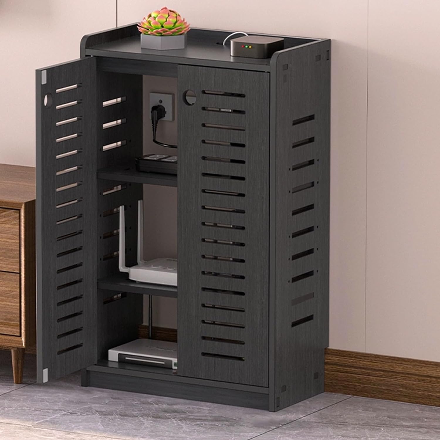 This router storage cabinet combines an open, ventilated design, adjustable shelves, flame-retardant PVC material, spacious tiered storage, and easy installation. The open-frame structure ensures proper heat dissipation and unobstructed signal transmission, while the adjustable shelves allow for flexible organization. Constructed from flame-retardant, eco-friendly PVC, it provides a safe cabinet body. Its multi-tiered design hides cluttered cables and devices, and with modular installation and multiple size options, it adapts to a variety of settings. It is the ideal home accessory that balances practicality, safety, and aesthetics.Product SpecificationsProduct Name: Router & Cable Organizer Box / Floor-Standing Home Wi-Fi Decorative CabinetMaterial: PVC BoardSurface Finish: High-Temperature Hot PressingAvailable Colors: Walnut, White, GrayDesign Styles: Wi-Fi Pattern / LouveredDimensions: 50 x 60 x 25 cm, 50 x 80 x 25 cmPackage Contents: Wi-Fi Router Hidden Box x1